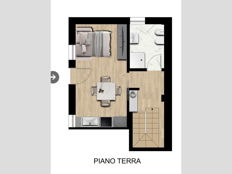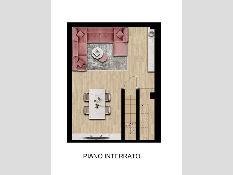 Appartamento n. 1A - monolocale con taverna. Al piano terreno troviamo la zona giorno/notte con cucina a vista e un bagno finestrato con doccia, Il piano seminterrato, collegato con una scala interna, ospita un ampia taverna.