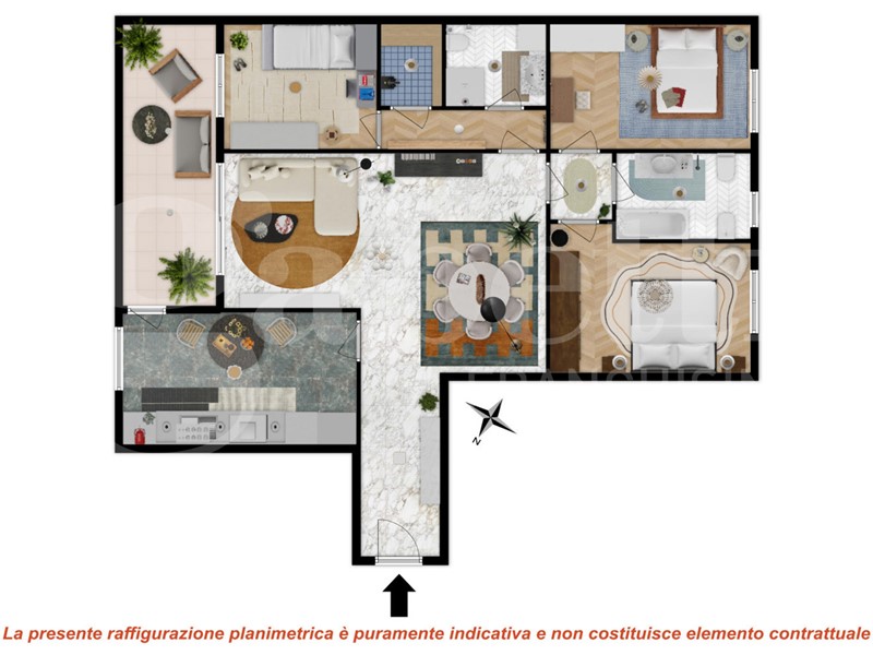 L'appartamento, caratterizzato da una piacevole doppia esposizione, si apre su un ampio ingresso che conduce alla cucina abitabile e a un grande soggiorno con accesso diretto al terrazzo loggiato, perfetto per momenti di relax all'aperto.