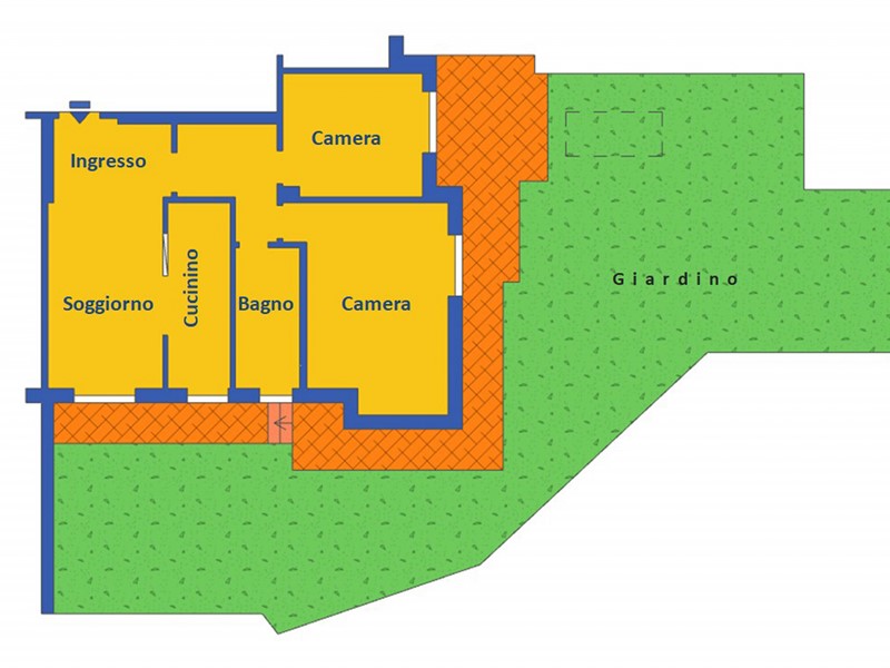 L'appartamento si presenta internamente in buono stato ed abitabile con un bell'ingresso aperto sulla cucina a vista, le due camere da letto ampie, il bagno e il giardino che si apre ad est, di ottime dimensioni e molto vivibile, in parte piantumato e in parte terrazzato, adatto da vivere per la stagione in arrivo.
