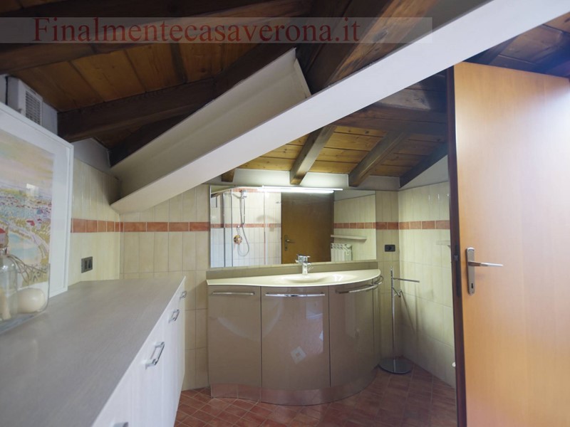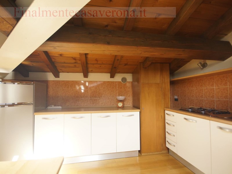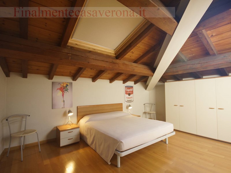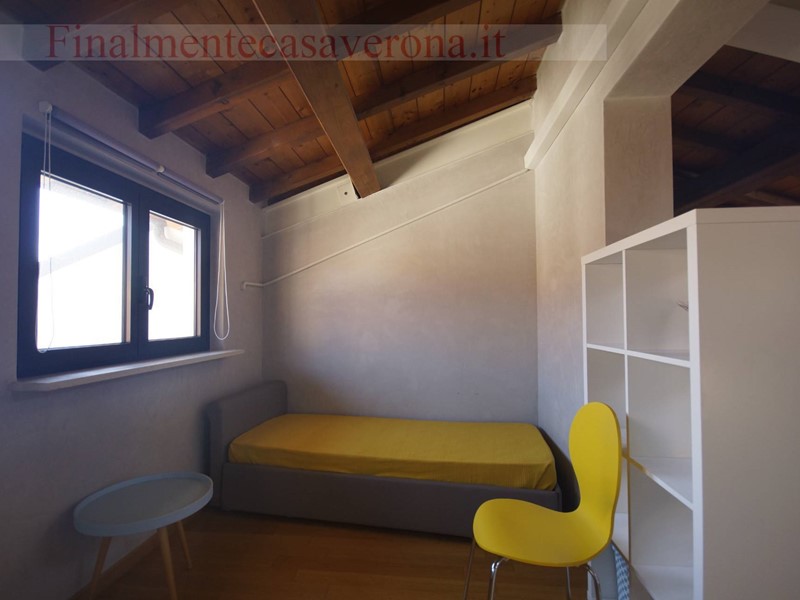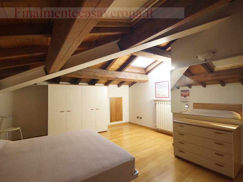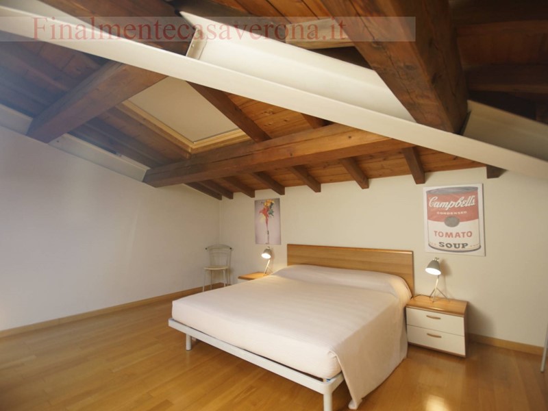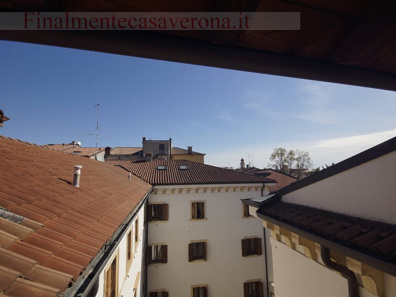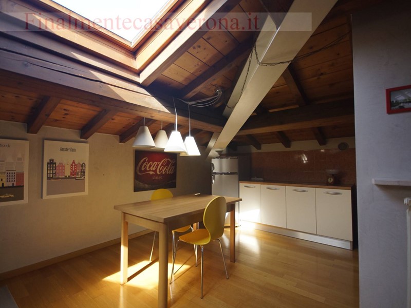 La distribuzione degli spazi è funzionale: zona giorno con angolo cottura a vista, ampia camera matrimoniale, bagno cieco con doccia e uno studiolo utilizzabile anche come seconda zona notte o spazio lavoro, con suggestiva vista sui tetti di Verona.