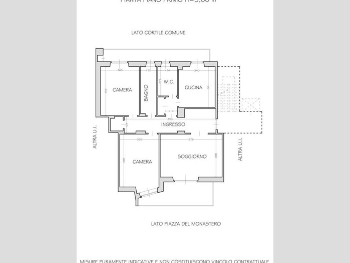 Composto da: ampio ingresso, sala con accesso a terrazzino vivibile con affaccio sulla piazzetta, cucina abitabile con balcone, due camere da letto, ripostiglio e doppi servizi finestrati. Completano la proprietà una cantina e una soffitta. Da aggiungere al prezzo dell'appartamento vi è un box auto singolo situato al piano sottostante l'immobile a ?. 30.000,00.