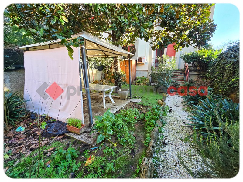 L'immobile si sviluppa su un unico livello ed è composto da: Ingresso, Cucina Semiabitabile completa di Ripostiglio e con accesso diretto al Giardino di circa mq.100, poi abbiamo la Sala, una comoda e spaziosa Camera Matrimoniale, un Vano senza finestra utilizzato come Studio o Stanza Armadi ed il Bagno finestrato. Il Riscaldamento e' Centralizzato con radiatori in alluminio e le spese condominiali mensili ammontano a circa ? 180 che includono la gestione dei Giardini comuni, sempre curati e gradevoli, il Portiere, Amministratore, Riscaldamento, Acqua calda e Acqua fredda. I pavimenti sono in gres porcellanato e parquet (Camera) e gli infissi esterni in legno monovetro.