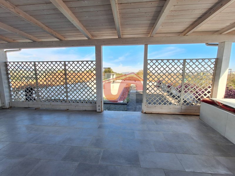 Dall'ampia zona living tramite una porta finestra scorrevole si accede ad un gradevole terrazzo a livello in parte verandato con patio e piscina, nonché annesso locale tecnico e deposito al di sotto della piscina che comprende un ulteriore servizio.