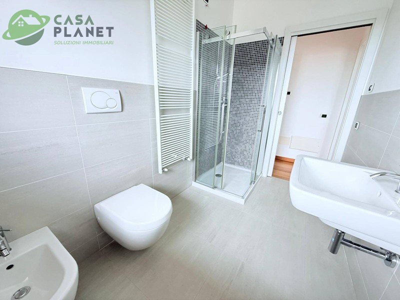 In classe energetica B, palazzina di recente costruzione, attico all'ultimo piano con ascensore, con legno dappertutto, tapparelle elettriche, videocitofono, aria condizionata con due split, soggiorno e camera, riscaldamento a pavimento, vetrocamera legno rovere chiaro, porte laccate bianche. Spese condominiali annuali di circa 1900 euro compresa acqua.