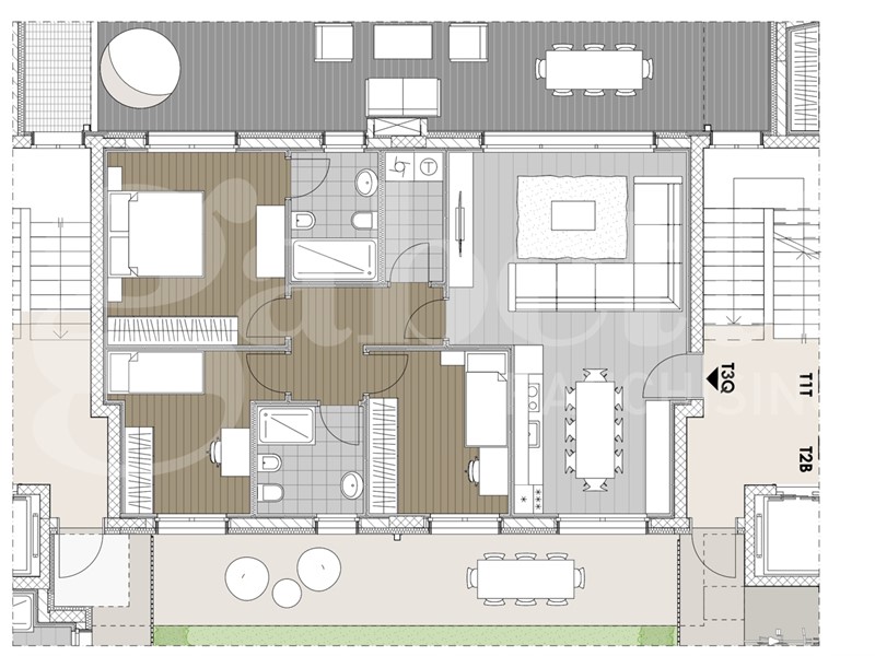 L'unità vanta spazi ben distribuiti e finiture di alta qualità; una zona giorno con doppio affaccio sul primo portico e sul primo giardino di circa 60 metri quadrati e sul secondo portico e secondo giardino di circa 139metri quadrati, una camera matrimoniale, due camere doppie, ripostiglio/lavanderia e due bagni. Tutte le camere dispongono di un affaccio su uno dei giardini.