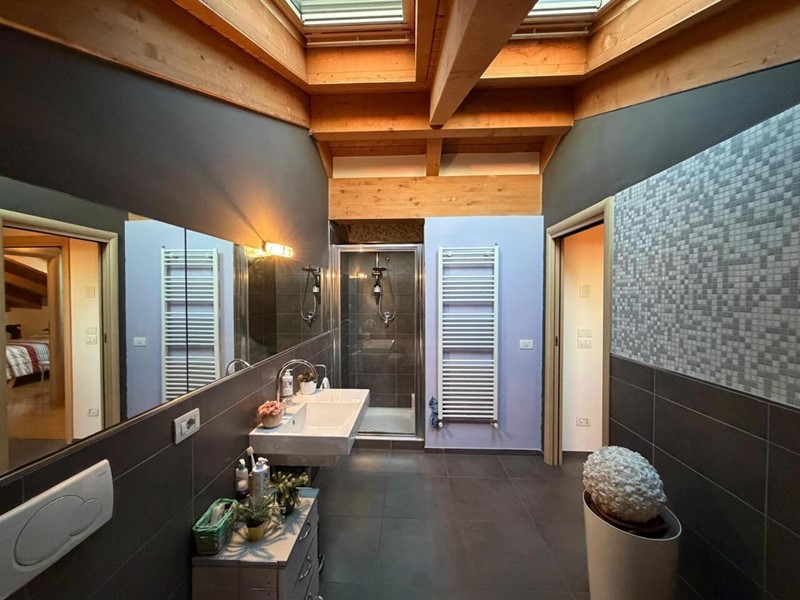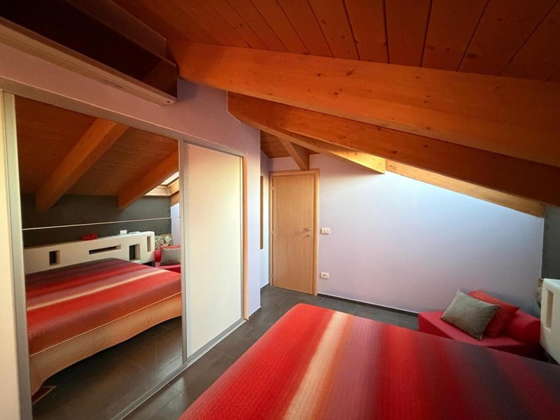 La disposizione interna comprende sul piano principale una camera matrimoniale con cabina armadio privata , un bagno finestrato elegante , spaziosa lavanderia/ripostiglio. Una scala conduce alla mansarda dedicata alla zona notte dove troviamo camere matrimoniali entrambe dotate di cabine armadio ed uno ulteriore bagno con vasca idromassaggio. Riscaldamento autonomo a pavimento, aria condizionata , videocitofono , portone d ingresso blindato. Completa la proprietà un garage al piano seminterrato