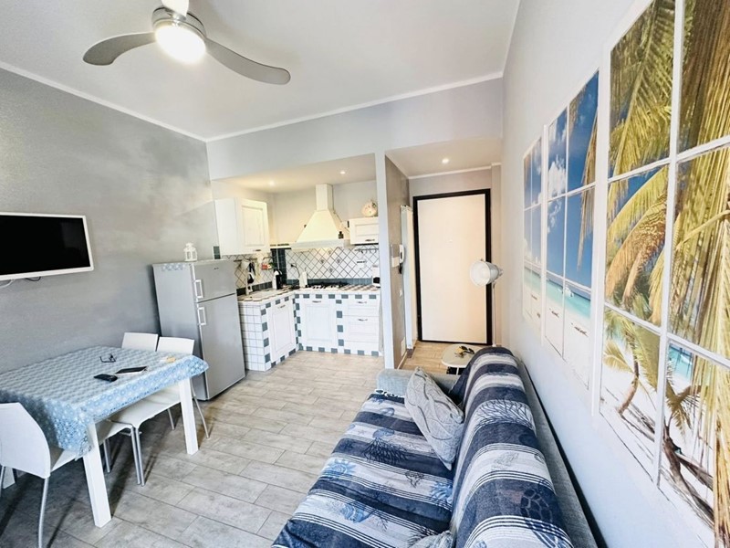 L’immobile si apre su un luminoso soggiorno con angolo cottura, dotato di divano letto e accesso diretto a un balcone con piacevole vista mare parziale. La zona notte comprende una camera matrimoniale con ulteriore balcone, anch’esso con scorcio sul mare, e un ampio bagno finestrato completo di doccia.