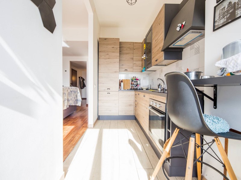 La sua superficie totale è di 83 metri quadrati, tutti calpestabili, e comprende Ingresso, una camera matrimoniale, bagno , sala con angolo cottura, stanza lavanderia, dispense. Parquet in tutta la casa.