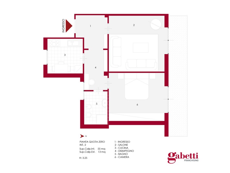 L'appartamento, di circa 55 mq interni, è situato al secondo piano di uno stabile servito da ascensore. Gli ambienti, ben distribuiti, si compongono di ingresso, accogliente salone, disimpegno con cucina, camera da letto e bagno.