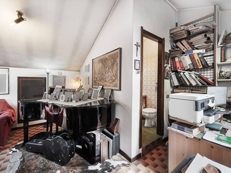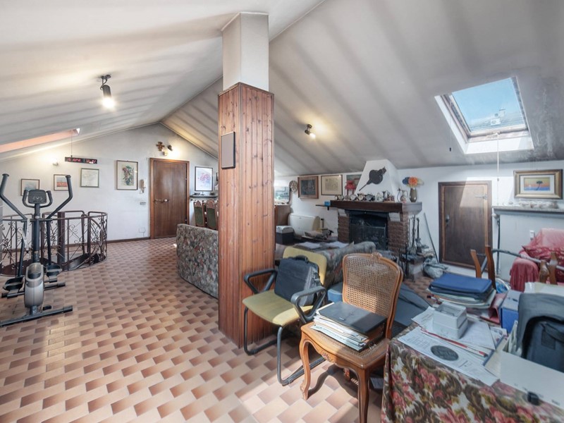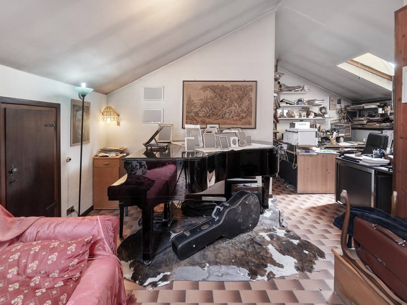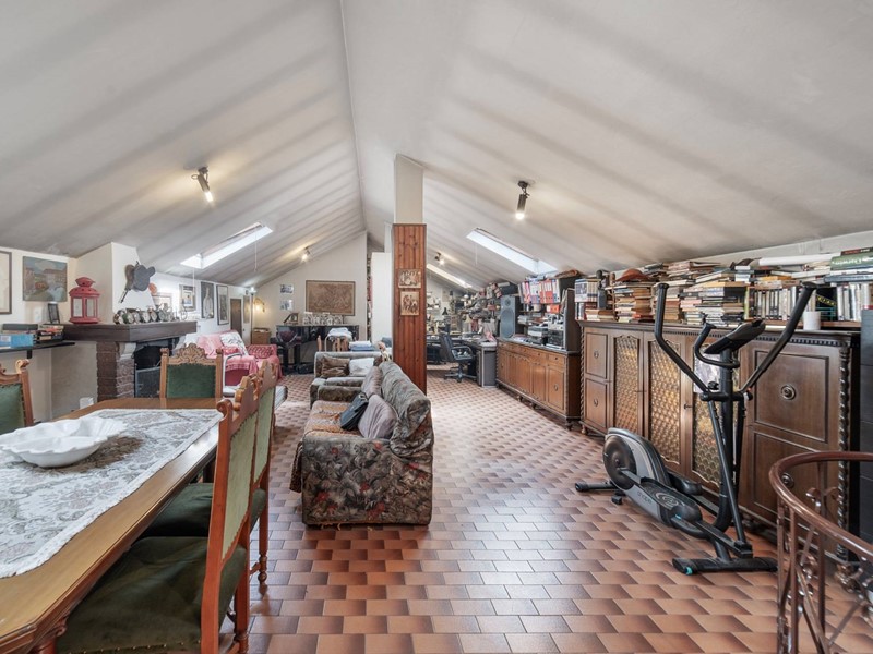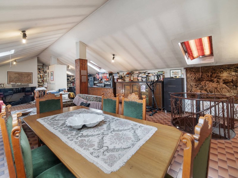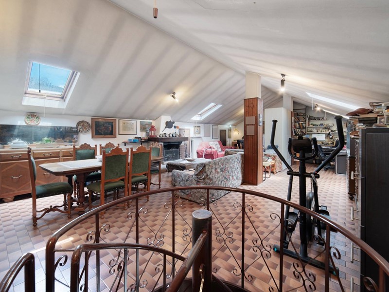 Al piano superiore, raggiungibile sia dalle scale comuni che da unelegante scala a chiocciola interna, cè la zona mansarda, 72 mq (altezza interna 3,20 metri al colmo e 1,80 metri alla gronda), locale hobby/studio/sala musica, con proprio bagno e con la presenza di un caminetto a legna e di due ripostigli sotto tetto.