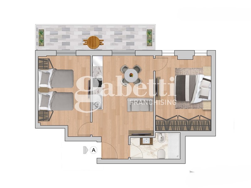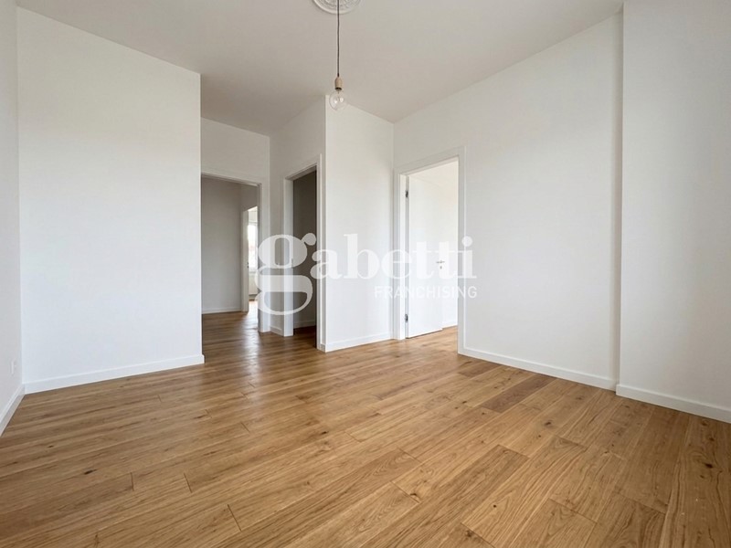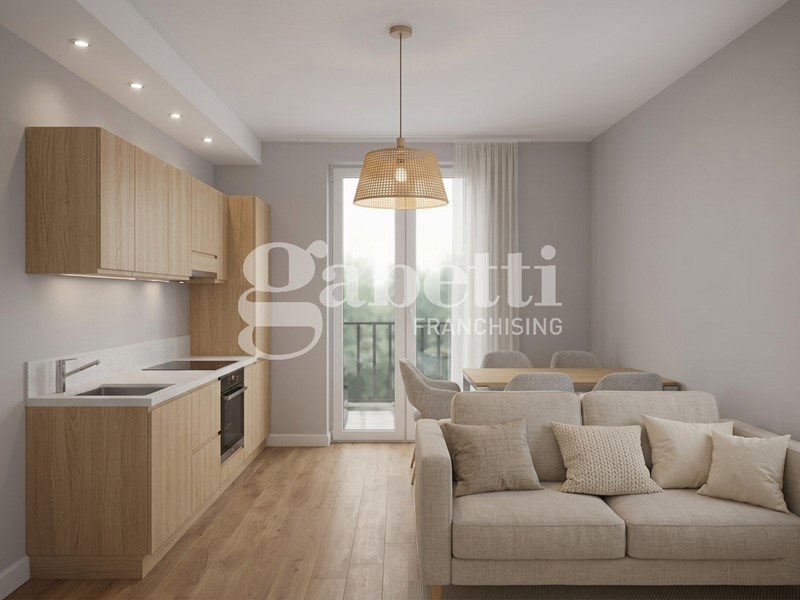 Nel dettaglio, l' appartamento è un moderno trilocale composto da ingresso su zona living con cucina a vista, camera da letto matrimoniale, camera da letto singola, bagno e comoda terrazza accessibile sia dalla zona giorno che da una camera da letto.