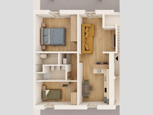 L’immobile è composto da: ampio soggiorno con angolo cottura e accesso diretto al resede, camera matrimoniale con bagno privato, camera singola, ripostiglio, secondo bagno.