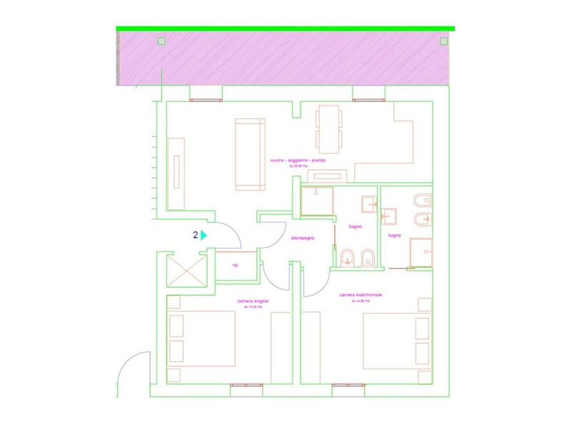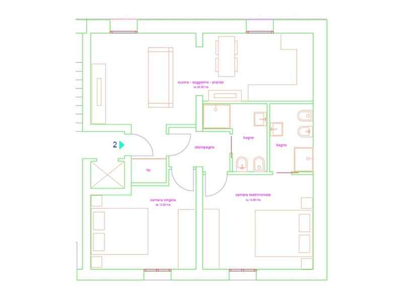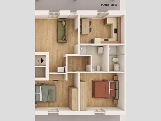 L’immobile è composto da: ingresso, ampia zona giorno con angolo cottura e accesso diretto al resede, ripostiglio, disimpegno notte, camera matrimoniale con bagno privato, camera singola, e secondo bagno.