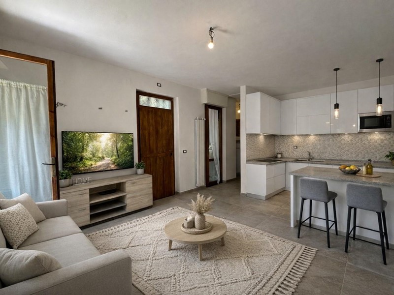 L’ingresso si apre su una luminosa zona giorno open space con angolo cottura, dalla quale si accede direttamente al giardino frontale, perfetto per momenti di relax all’aperto.