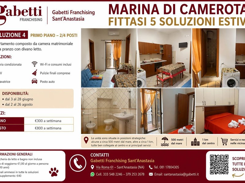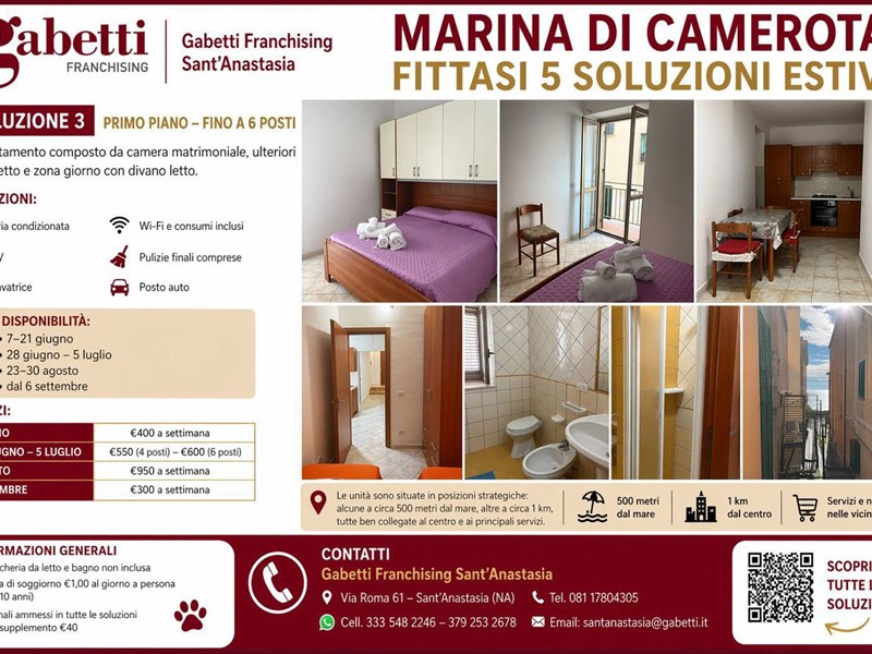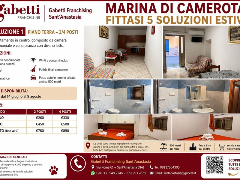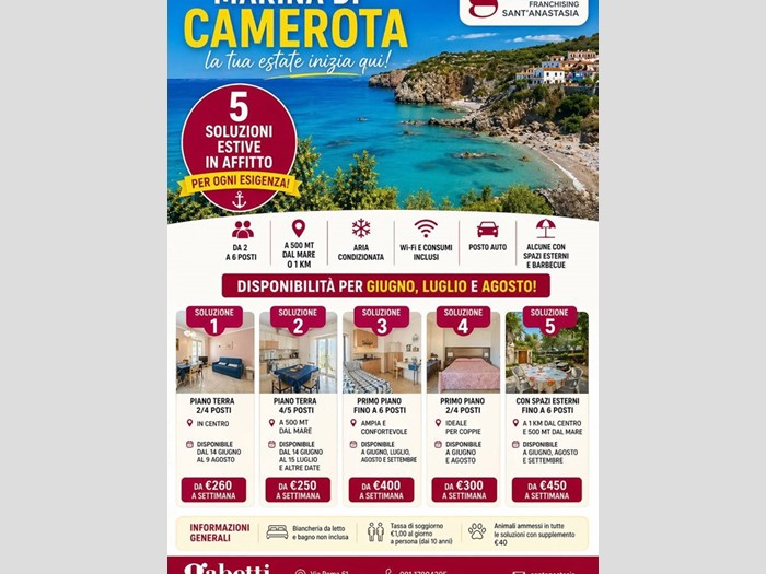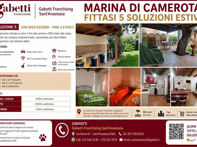 GABETTI FRANCHISING SANT'ANASTASIA propone in affitto 5 diverse soluzioni abitative a Marina di Camerota, ideali per vacanze estive, con disponibilità e caratteristiche differenti.