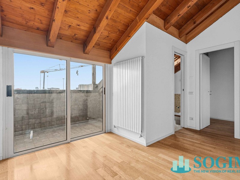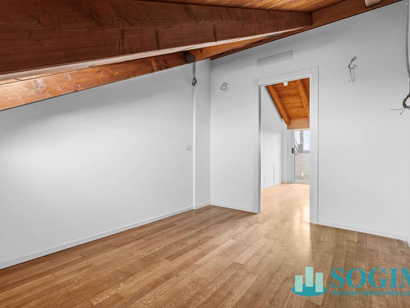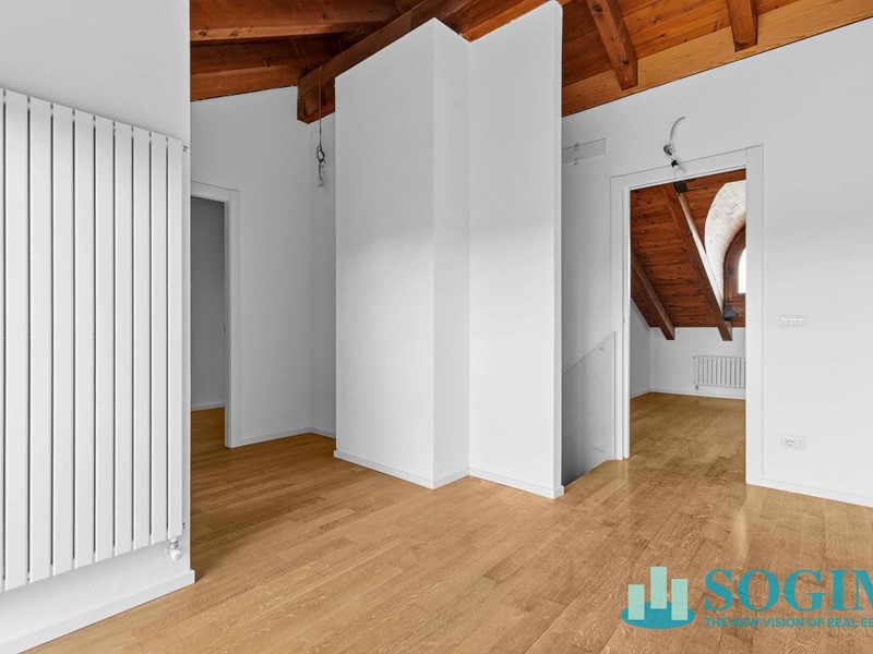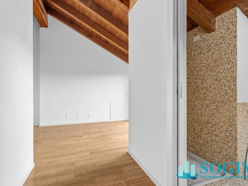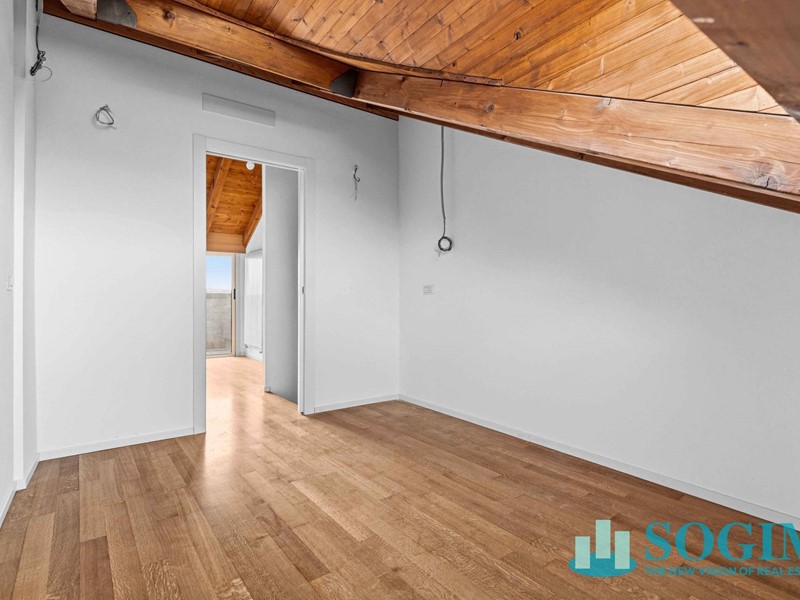 Il quarto piano si caratterizza per i soffitti con travi in legno a vista, che regalano fascino, calore e un tocco di autentica eleganza a ogni ambiente.