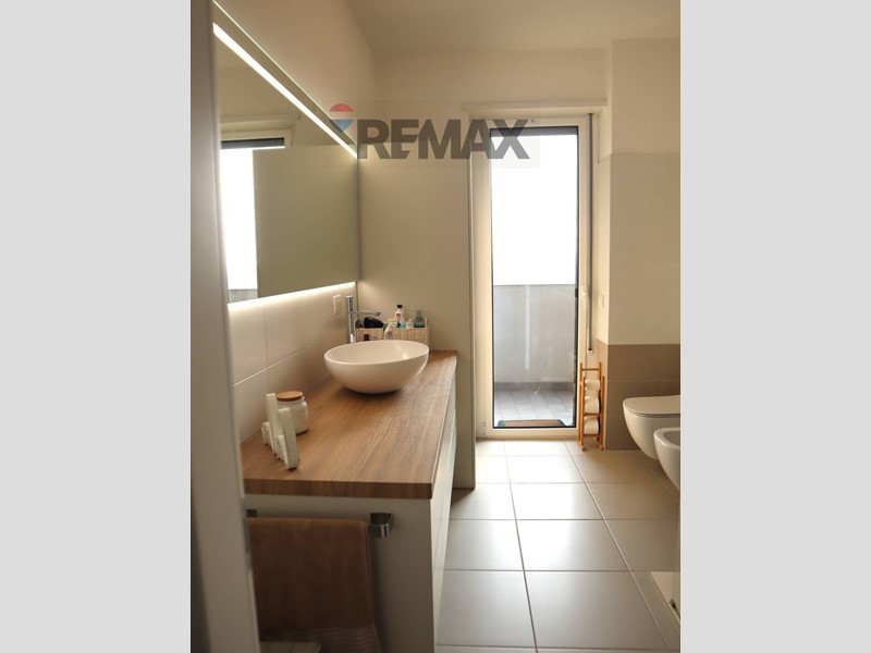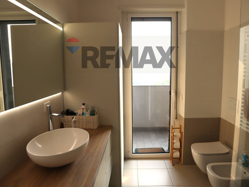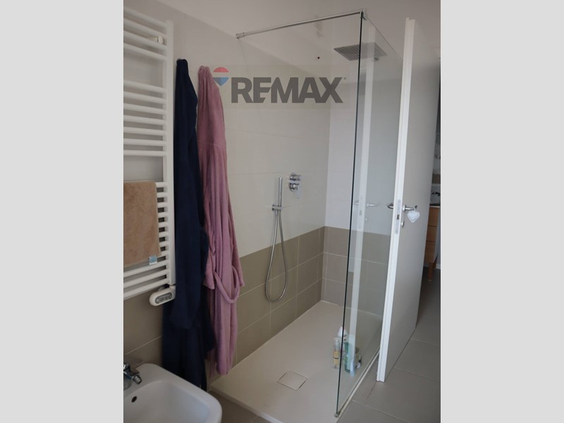 Il bagno è moderno e dotato di tutti i comfort, tra cui una spaziosa doccia, sanitari sospesi e scaldasalviette.