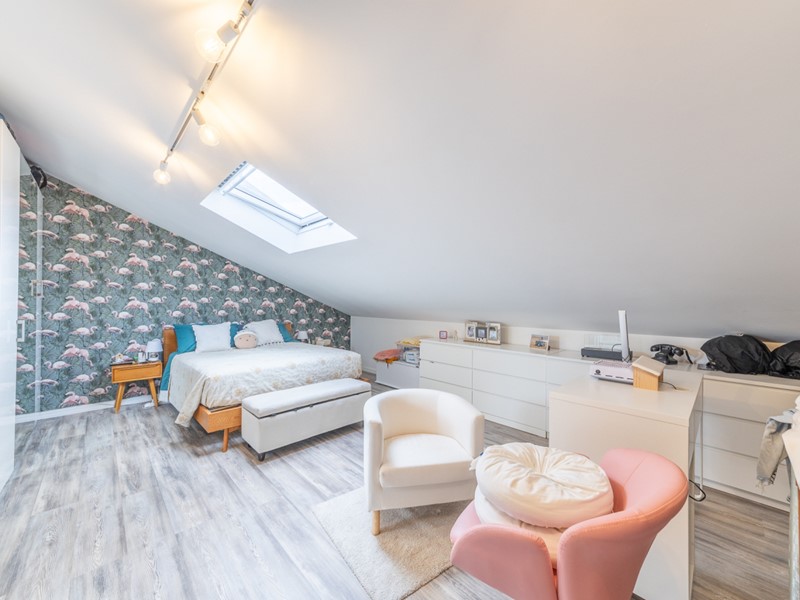 Al piano superiore, mansardato, si sviluppa la zona notte composta da due camere e un secondo bagno, in un ambiente riservato e ben distribuito.