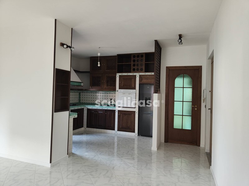Un accogliente ingresso che si apre su un luminoso soggiorno con cucina in muratura completa di elettrodomestici.