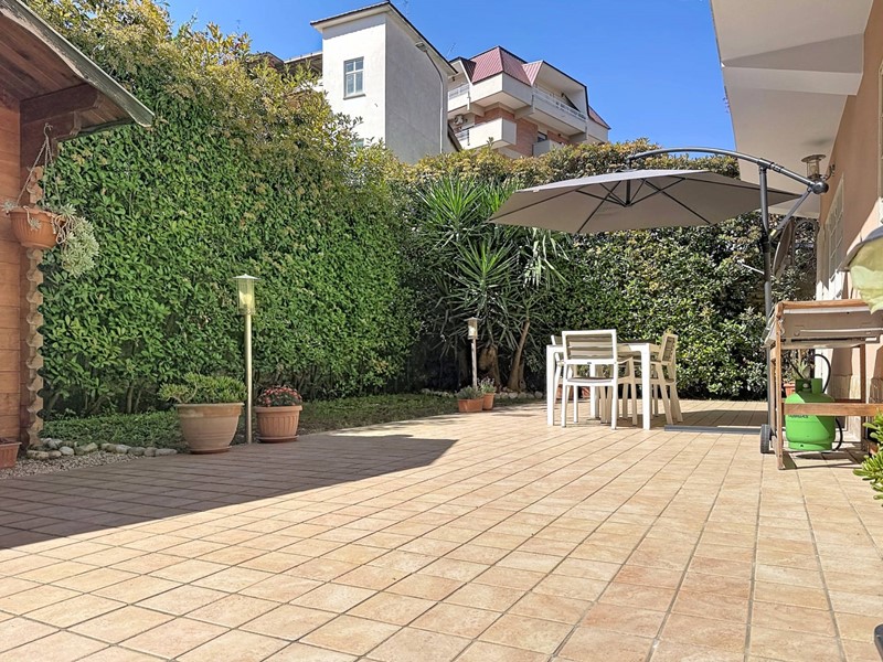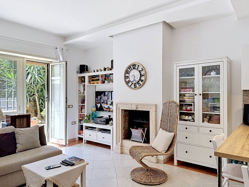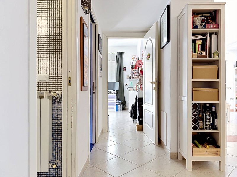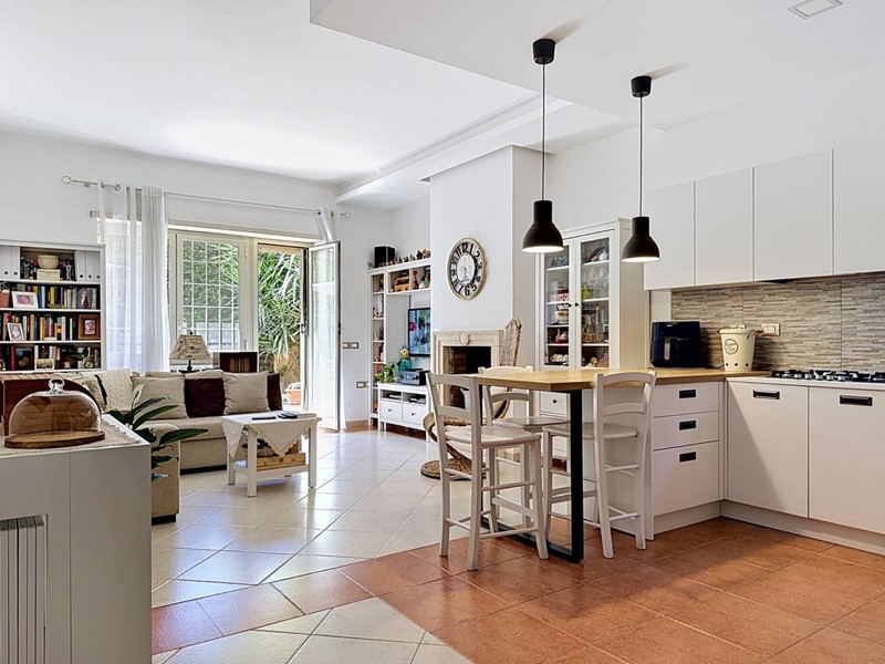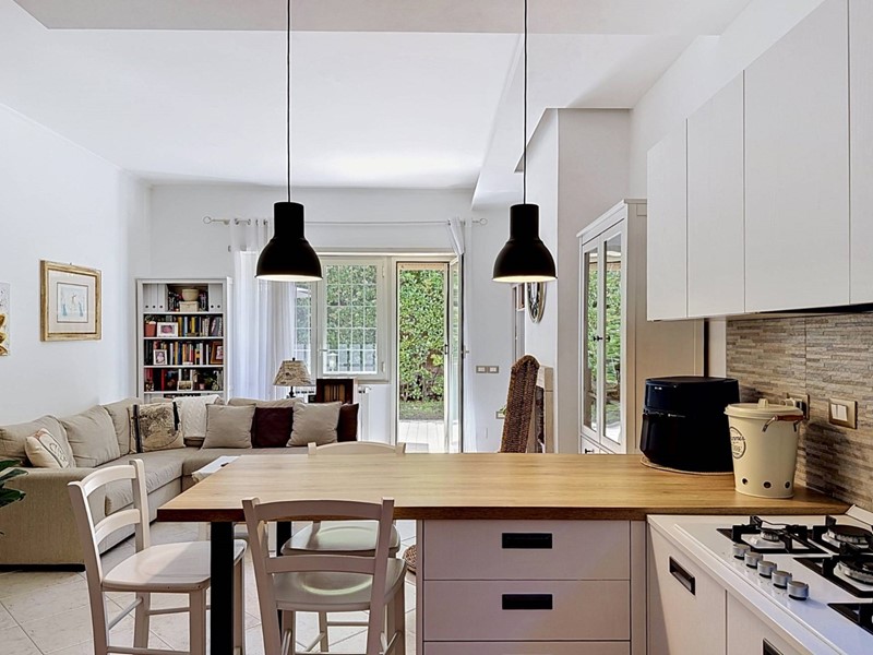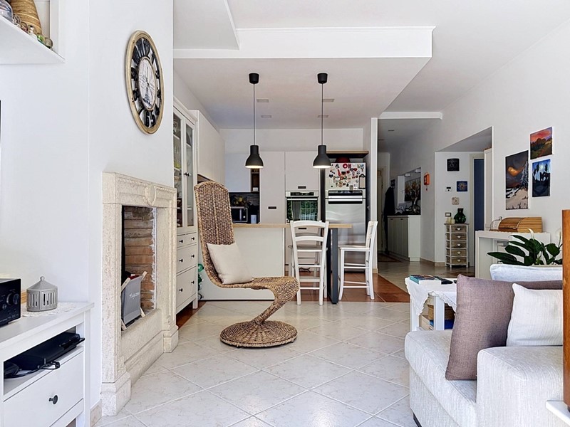 Lappartamento è composto da un ingresso dal quale si accede a unampia zona living, caratterizzata da un salone doppio con camino e da una cucina a vista perfettamente integrata nellambiente. Un disimpegno collega la zona giorno alla zona notte, composta da due camere matrimoniali e da due bagni entrambi dotati di finestra. Tutti gli ambienti, ad eccezione dei servizi, godono di un accesso diretto al giardino perimetrale di circa 150 mq, parte pavimentato e parte a verde, uno spazio esterno che amplia in modo significativo la vivibilità della casa durante i mesi compresi tra aprile e ottobre.