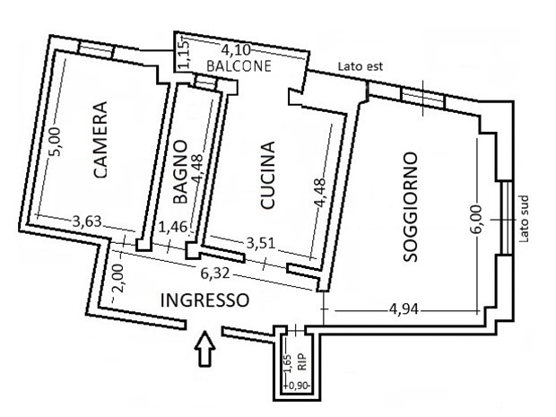 COMPOSIZIONE INTERNA: doppia esposizione est/sud, ingresso, soggiorno, cucina abitabile, una camera, un bagno, ripostiglio ed un balcone e cantina al piano interrato;