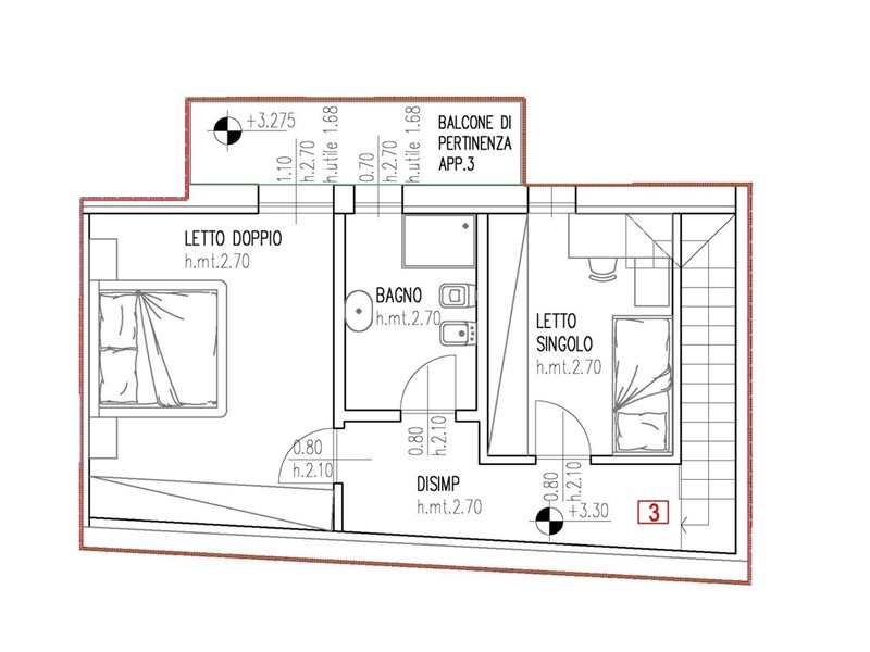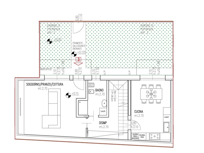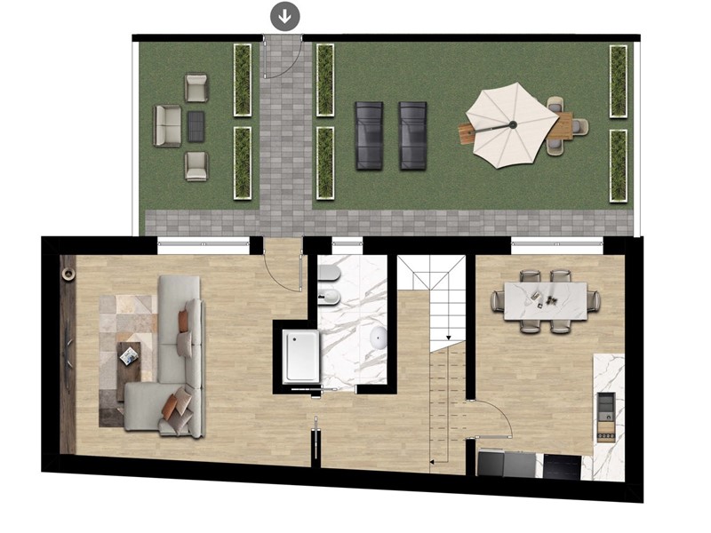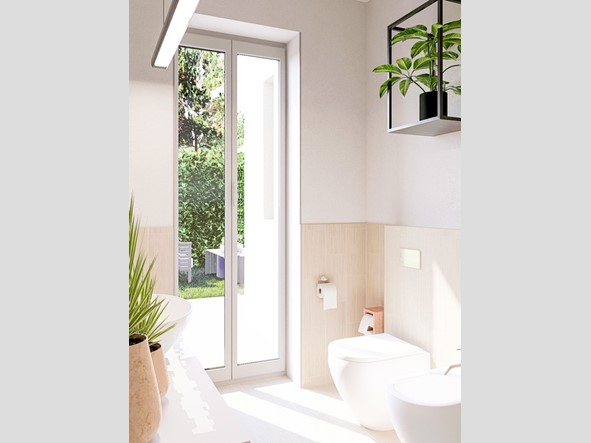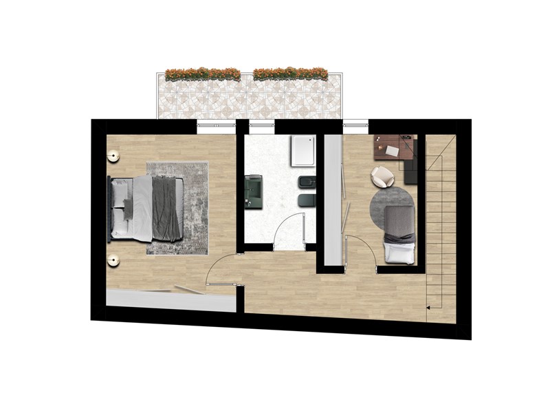 Appartamento n. 3 - trilocali disposti su due livelli. Il piano terra ospita un ampio living con cucina separata e accesso al giardino privato, oltre a un bagno finestrato. Al primo piano, collegato con una comoda scala interna, si sviluppa la zona notte, composta da una camera matrimoniale, una cameretta entrambe con accesso al balcone e un bagno disimpegnato.