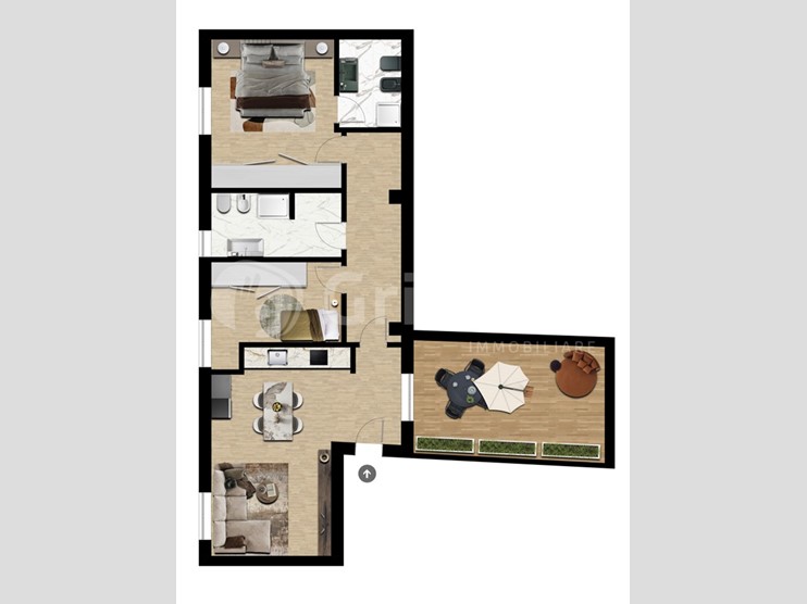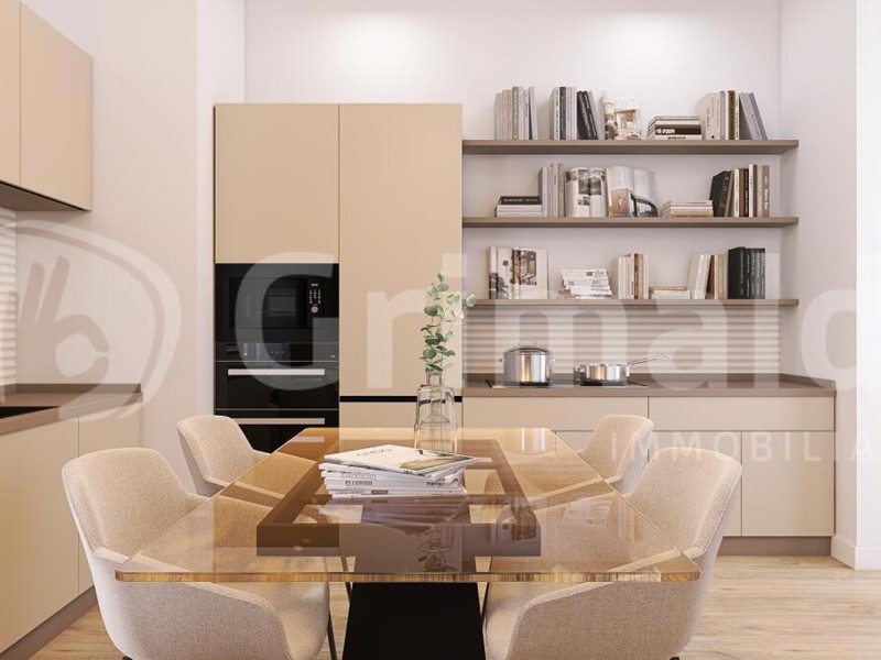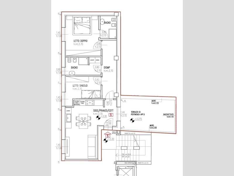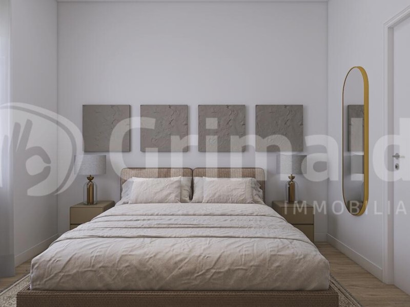 Appartamento n. 5 - trilocale al primo piano, composto da ingresso che si apre sulla zona living con cucina a vista e affaccio su ampio terrazzo. La zona notte comprende una camera padronale con bagno en suite, oltre a una seconda cameretta e a un bagno disimpegnato.