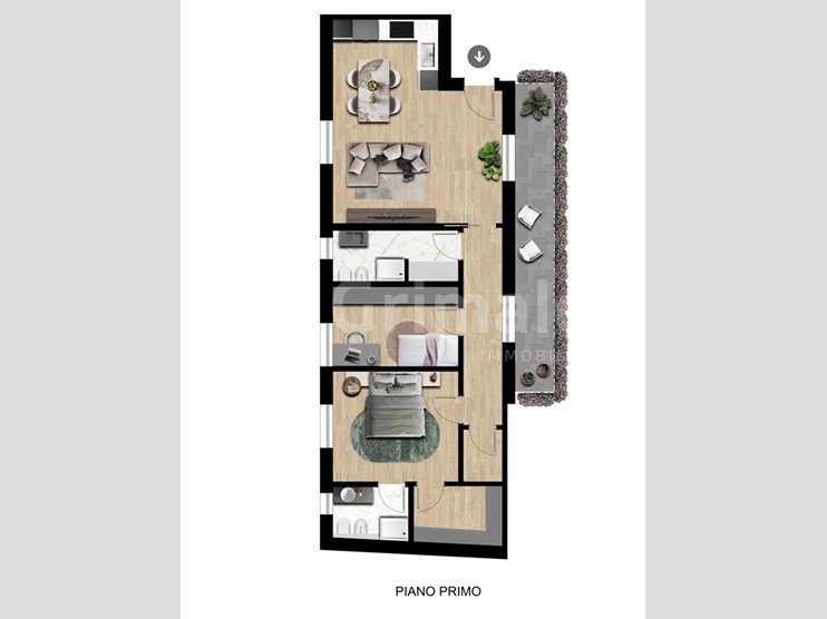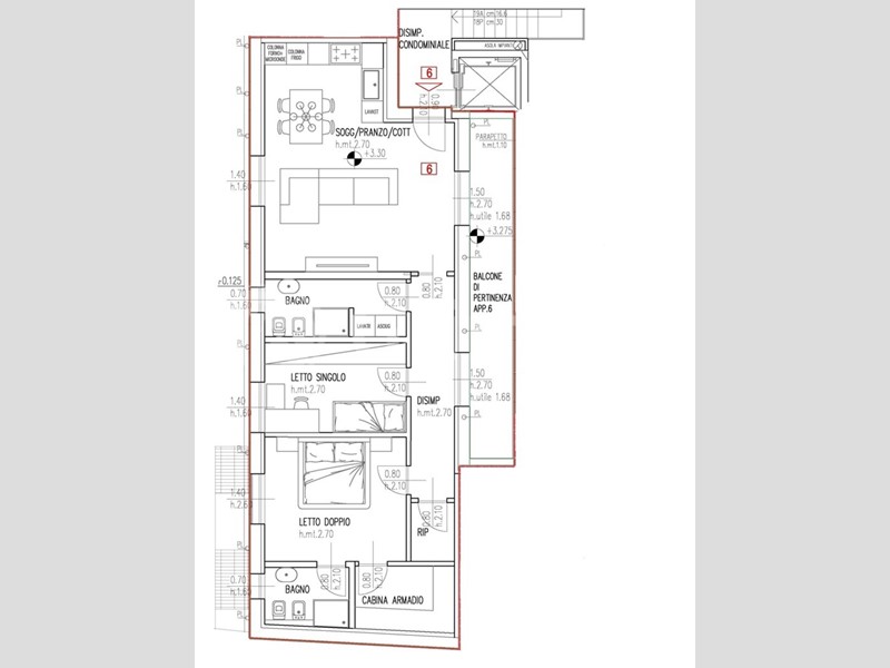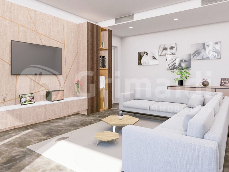 Appartamento n. 6 - trilocale al primo piano, composto da ingresso che si apre sulla zona living con cucina a vista. La zona notte comprende una camera padronale con cabina armadio e bagno en suite, oltre a una seconda cameretta e a un bagno disimpegnato.