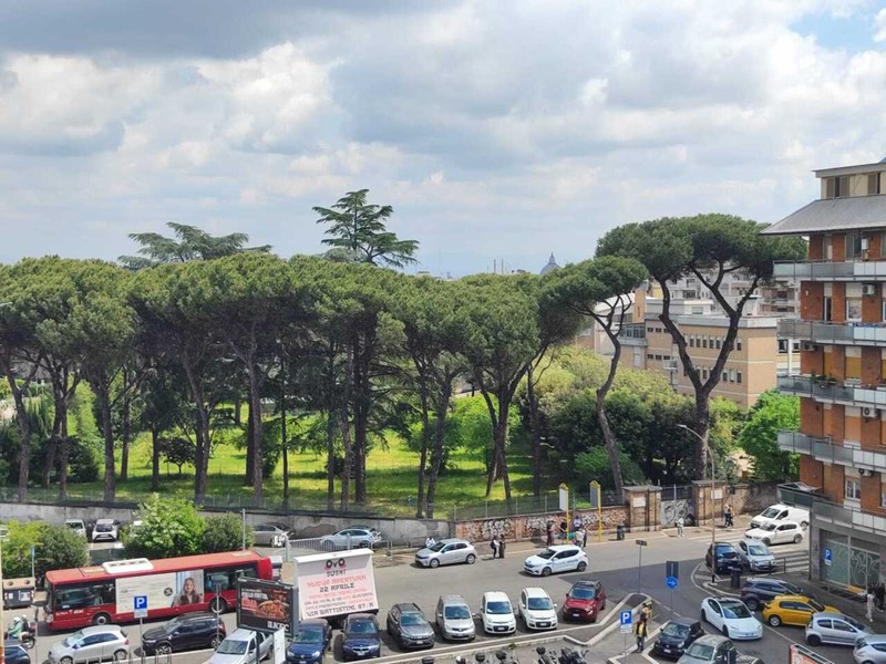 Vista aperta su Roma con scorcio sul Cupolone e affaccio verso Pineta Sacchetti.