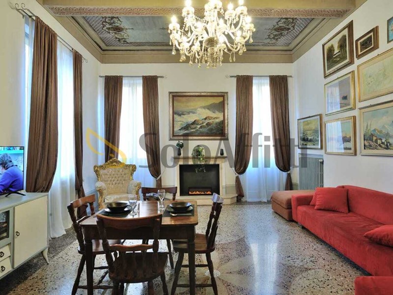 MODENA CENTRO: A due passi dalla Ghirlandina si affitta prestigioso appartamento situato al piano nobile composto da ingresso, cucinotto, camera matrimoniale, camera singola, ampio salone di rappresentanza di circa 40 mq. con soffitti a cassettoni alti 4 mt e pavimento in battuto veneziano e luminoso balcone, bagno ed ampia cantina al piano terra. L'appartamento si trova in ottime condizioni ed è dotato di riscaldamento autonomo. Già LIBERO . Prezzo 796€ più 60 le spese condominiali.