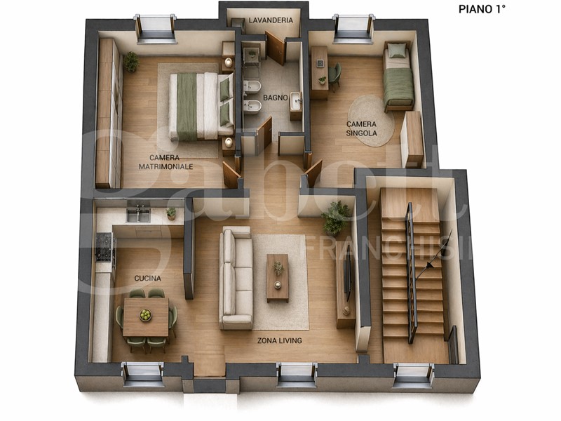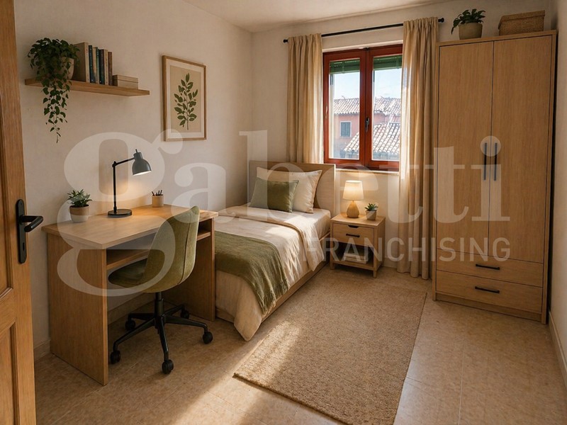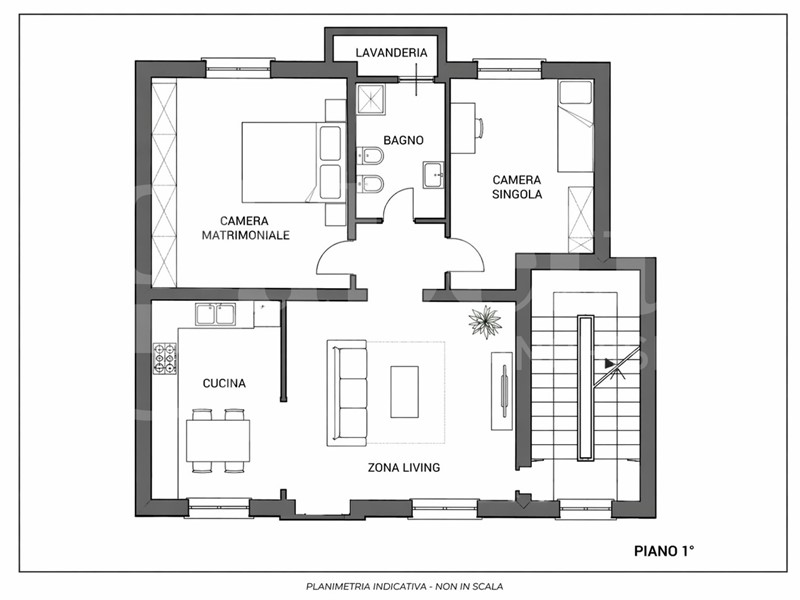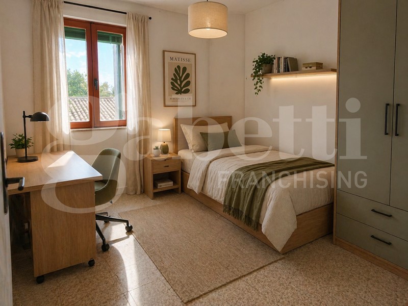 La disposizione interna: Ingresso accogliente; Cucina abitabile spaziosa; Camera matrimoniale ampia e luminosa; Camera singola ideale per ospiti o studio; Bagno e pratico ripostiglio (con predisposizione per diventare una comoda lavanderia).