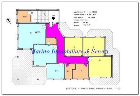 1° piano appartamento di mq. 189, studio, cucina con ripostiglio e salone e 3 camere da letto, per la funzionalità dell'appartamento è situato un ripostiglio posto sul vano scala di circa 9,50 mq. ed oltre 60 mq di terrazza e balconi.