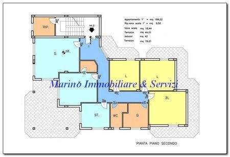 2° piano appartamento di mq. 189, studio, cucina con ripostiglio e salone e 3 camere da letto, per la funzionalità dell'appartamento è situato un ripostiglio posto sul vano scala di circa 9,50 mq. ed oltre 60 mq di terrazza e balconi.