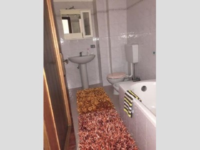 Attraverso la porta blindata si accede all'ampio ingresso living con cucina abitabile. Adiacente al living è presente il bagno di servizio, completo di box doccia.