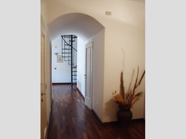Un ampio ingresso distribuisce la zona giorno composta da sala con balcone esposto a sud, cucina abitabile, bagno e ripostiglio, una scala a chiocciola in ferro e legno di pregevole fattura conduce al soprastante terrazzo.