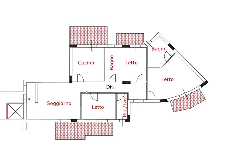 L'appartamento è composto da un ampio soggiorno, una cucina abitabile, bagno, due camere da letto, una grande camera matrimoniale con un ampio bagno interno corredato di vasca idromassaggio, infine un comodo ripostiglio/lavanderia con attacco lavatrice e lavatoio. Tutti gli ambienti hanno l'uscita verso i terrazzi.