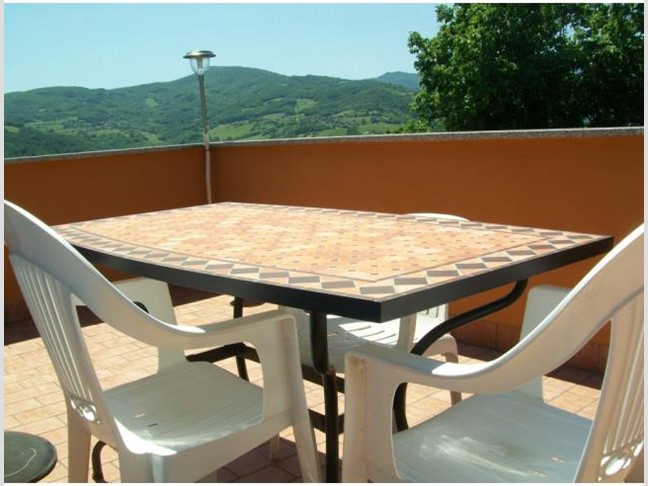 Pavimento in cotto con soffitto camera da letto in legno.In piu'vi e' un grande terrazzo pavimentato e piastrellato per interperie, che domina su vista panoramica.Cosi' come il balcone. Tutto nuovo, mobili e sanitari installati, cucina, scala, intonaco pareti.Tutto fabbricato nel 2006.