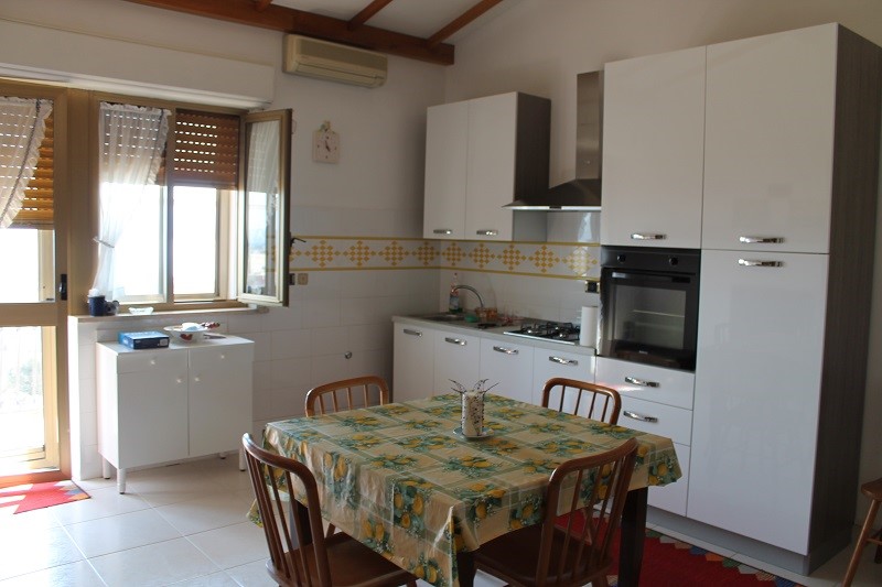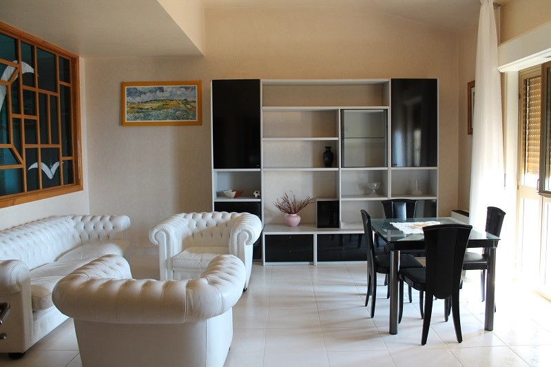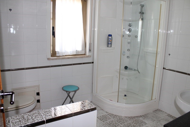 Per maggiori dettagli : Il luminoso salone divide il corridoio con una grande vetrata artistica. Il caminetto moderno è collegato con un secondo caminetto alla cucina. Quest’ultima è capiente e possiede una comoda dispensa incassata a muro. Cucina e salone si affacciano su un lungo e grande balcone con bellissima vista e dal quale si può ammirare tutta la città a 180° e la Sicilia. Accanto l’ingresso si trova un ampio ripostiglio con scaffalatura, segue un secondo bagno con doccia incassata a muro che serve la zona giorno. Aria condizionata. Riscaldamento. Doppi infissi.