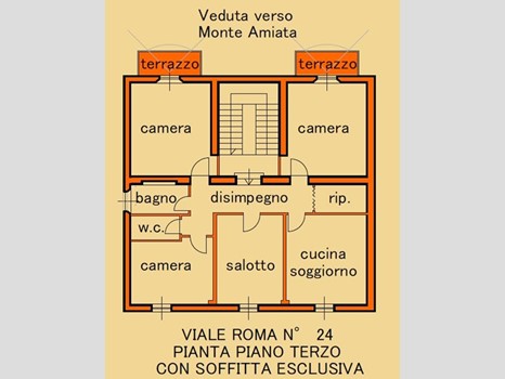 L’alloggio è di mq 110, composto da cucina abitabile, soggiorno, tre ampie camere, due bagni, ripostiglio/lavanderia, due terrazze, posto al terzo e ultimo piano con soprastante soffitta, termo singolo con predisposizione per l’allaccio alla rete pubblica del metano.