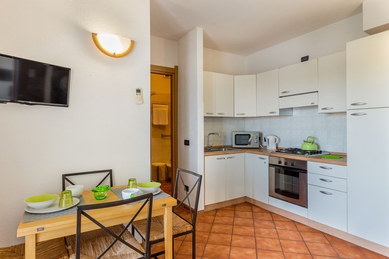 appartamento bilocale in residence con piscina completamente arredato affacciato sul porto turistico di La Caletta. Dispone di ascensore,aria condizionata, piscina, giardino comune