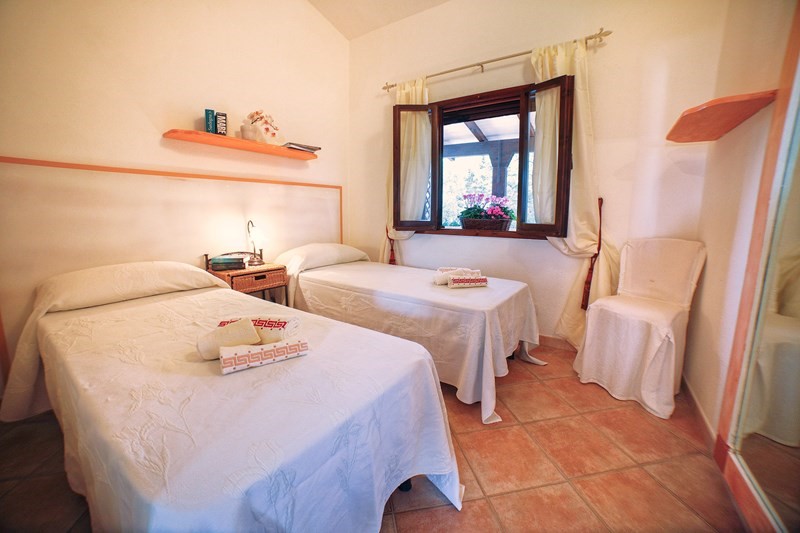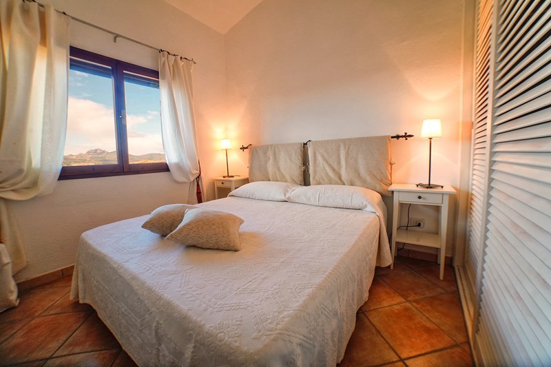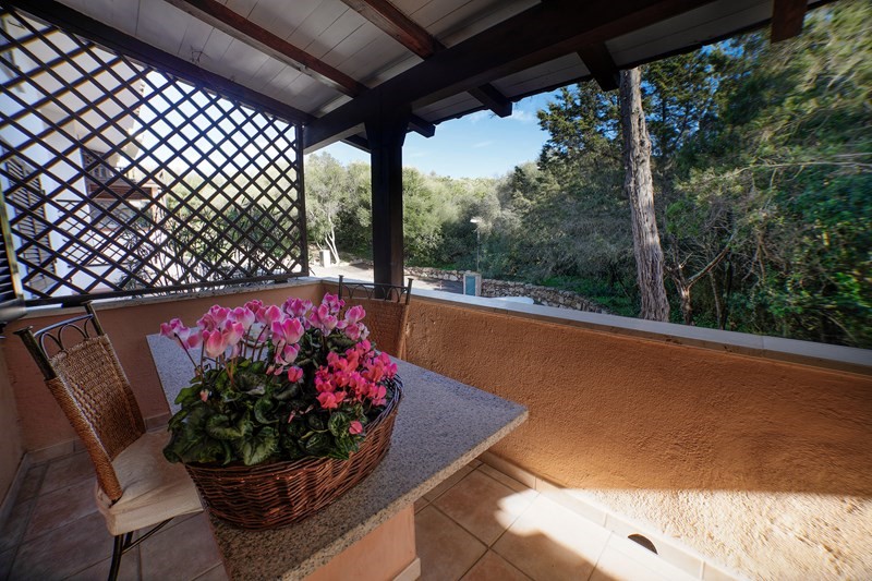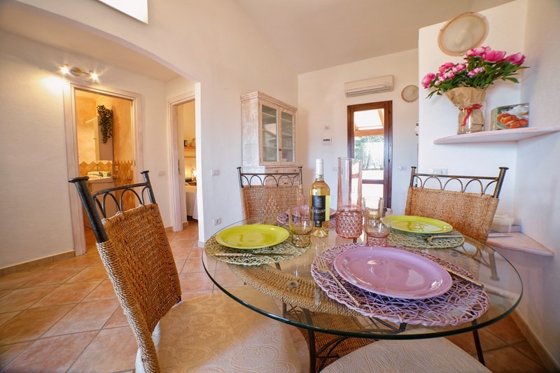 Dalla porta d'ingresso, preceduta da una graziosa terrazza affacciata su uno spazio verde, si accede a un' ampia e luminosa zona living  con cucina a vista e accesso diretto su una seconda terrazza dalla quale si gode della vista sul  Golfo di Cugnana.