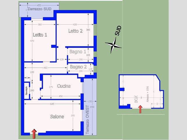 L'appartamento e di circa 110 metri quadri complessivi di cui 92 interni, 8 metri quadri la terrazza SUD e 10 metri quadri la terrazza OVEST. L'interno e costituito da 1 salone, 1 cucina, 1 ripostiglio, 2 bagni, 2 camere da letto ed un ampio corridoio che raccorda tutti gli ambienti.