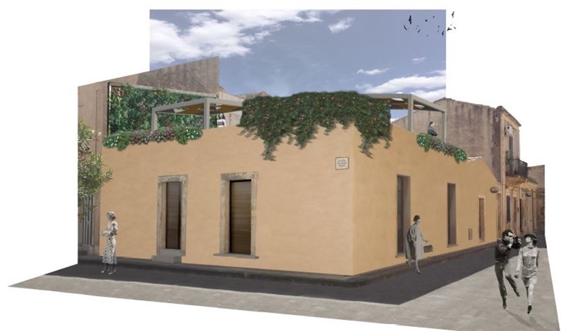 L’immobile si trova nel cuore di Noto, simbolo del barocco sud orientale della Sicilia, ed è oggetto di intervento. Il progetto ha previsto la ristrutturazione e le modifiche interne mediante opere di manutenzione ordinaria e di adeguamento funzionale degli ambienti interni. L’edificio ha una struttura portante in muratura, solai in latero cemento e coperture in legno con soprastante manto di tegole in coppi siciliani, l’intero volume si sviluppa su un livello. Si prevedono interventi sulle murature interne e di finitura come la rimodulazione della zona giorno, costituita da un’ampia zona ingresso-soggiorno dove si affacciano le due camere da letto, una con bagno in camera, e dalla quale si accede, tramite un disimpegno con vista sul nuovo giardino interno, alla cucina e sala da pranzo. E’ previsto un accesso principale su Via Cairoli che immette direttamente nell’ingresso soggiorno, mentre un secondo ingresso sarà previsto su Piazza Crispi con accesso diretto alla cucina e sala pranzo, oltre che accesso ristretto per ogni singola camera da letto. Nel progetto inoltre è stato realizzato un giardino interno dal quale, mediante una scala esterna, si potrà accedere al nuovo terrazzo realizzato con struttura portante in legno con vista sulla piazza e sulla Chiesa di San Pietro.