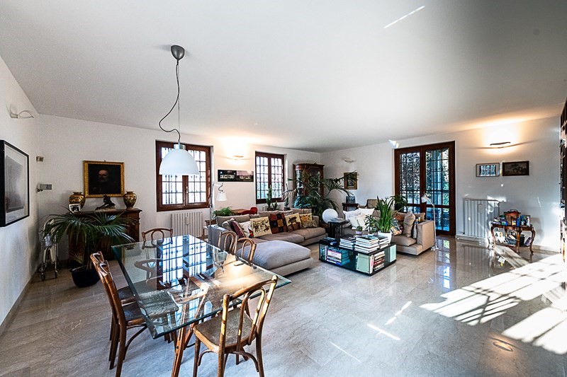 ingresso, salone doppio con due porte in vetro satinato Rimadesio, sala da pranzo, cucina, camera da letto, bagno con vasca idromassaggio, pavimenti in marmo.