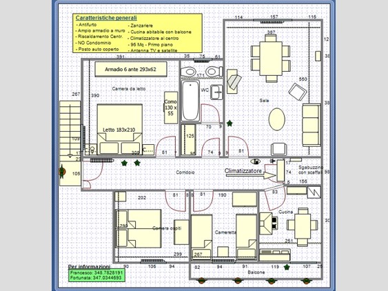 Appartamento in affitto in Zona riservata e tranquilla a pochi passi dal centro e dal mare, situato al primo piano vicino si trova l'ufficio postale, il supermercato ed a 650 mt il mare. 1 camera da letto matrimoniale , 1 camera ospiti matrimoniale 1 camera ragazzi con 2 letti, cucina abitabile, ampio salone, bagno, sgabuzzino arredato, lavatrice, vasca con box doccia, ampio armadio a muro, Antenna TV e Antenna satellite installata (decoder escluso), balcone, Posto auto coperto, riscaldamento centralizzato, antifurto, cassaforte, zanzariere, climatizzatore centrale, no condominio.