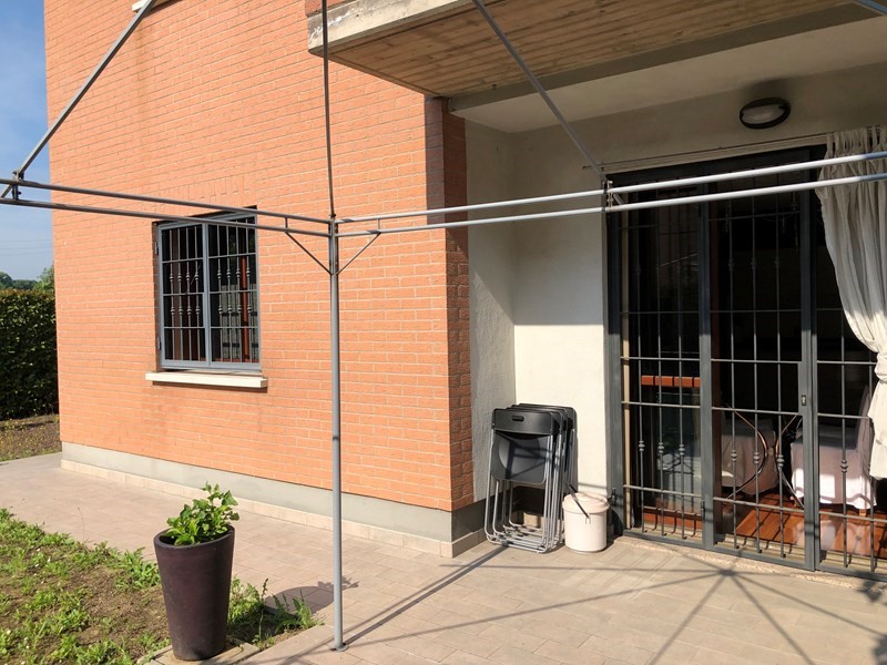 Dalla sala/soggiorno si acceda ad un giardino privato di circa 120 mq con impianto di irrigazione autonomo. Folta ed alta siepe garantisce la privacy del piano terra. Presenza di gazebo con telone rimovibile in inverno.