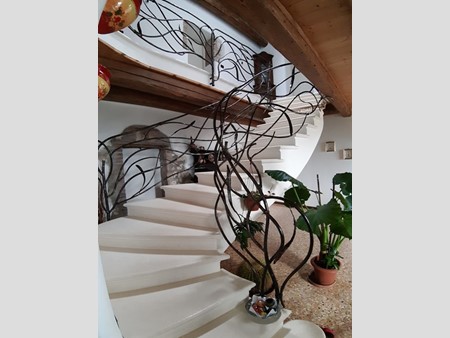 Scala interna in muratura con gradini in pietra bianca di Vicenza e ringhiera ferro battuto "nature". Completano la proprietà 13.000 mq di prato e un nuovissimo sistema di allarme e videosorveglianza.