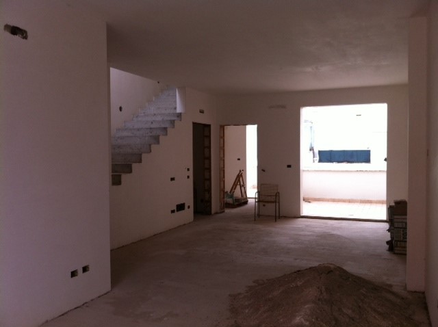 Abitazione indipendente su due piani, già completa di intonaci e di tutti gli impianti, da ultimare con pavimenti interni, impianti sanitari e infissi interni ed esterni. Situata in una strada centrale della città, si dispone su due livelli, a partire dal primo. Il primo piano ha una superficie coperta di circa 82 mq, con soggiorno, camera da letto, bagno, cucina semi abitabile, due comodi terrazzi separati di mq 18 complessivi, a servizio l’uno della cucina, l’altro del soggiorno, e un balcone prospiciente la strada. Si è attualmente scelto di unificare il soggiorno con la camera da letto, possibilità comunque reversibile grazie agli impianti presenti. Il secondo piano, raggiungibile con una scala interna che parte dal soggiorno, è dotato di vani tecnici per una copertura complessiva di 34 mq, che potrebbero dar luogo ad una diversa distribuzione, e di terrazzi a livello di 48 mq. Immobile esente da certificazione energetica.