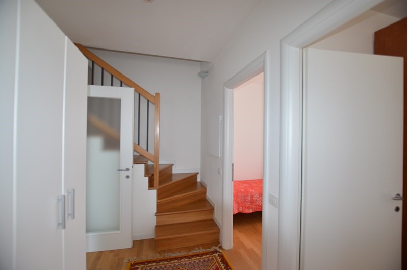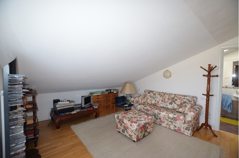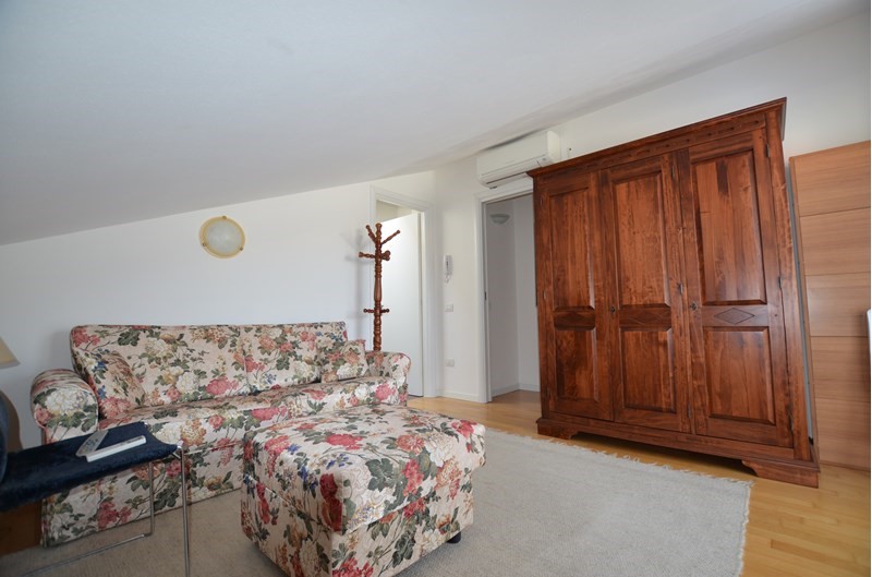 Dalla scala si accede poi al piano superiore (ed ultimo) dove troviamo il soggiorno mansardato con divano letto, si ha quindi la possibilità di creare un altra camera, un bagno con doccia finestrato e un piccolo solarium (per un totale complessivo delle terrazze pari a 21 mq).