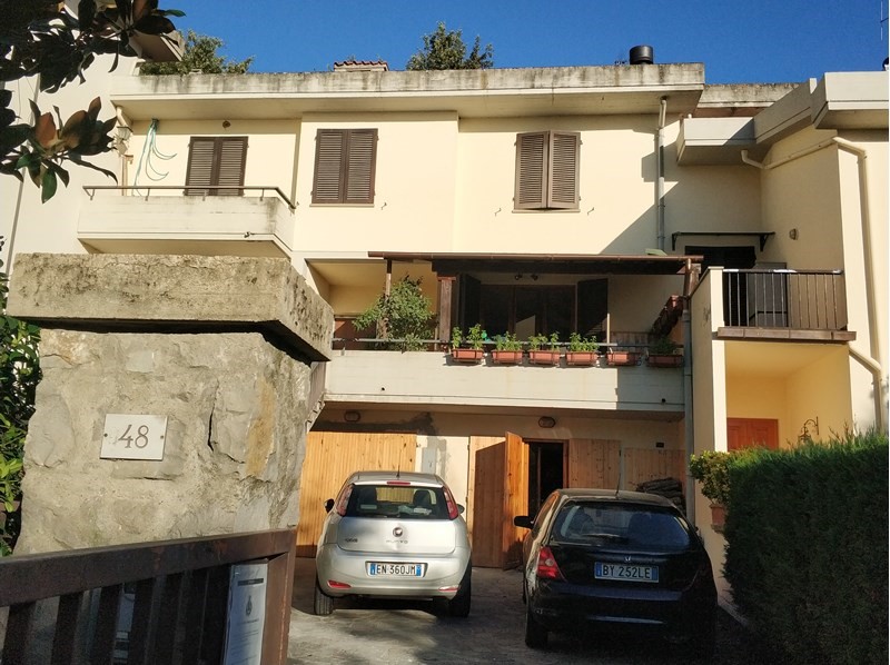 Vendita da privato. Privato vende elegante terratetto a schiera150 mq calpestabili oltre giardino, terrazze coperte e loggia in contesto paesaggistico panoramico. Doppia entrata, da scala su piazzale condominiale (scale da rimettere) recintato e indipendente da taverna. Particolari architettonici originali, moderni, di pregio.